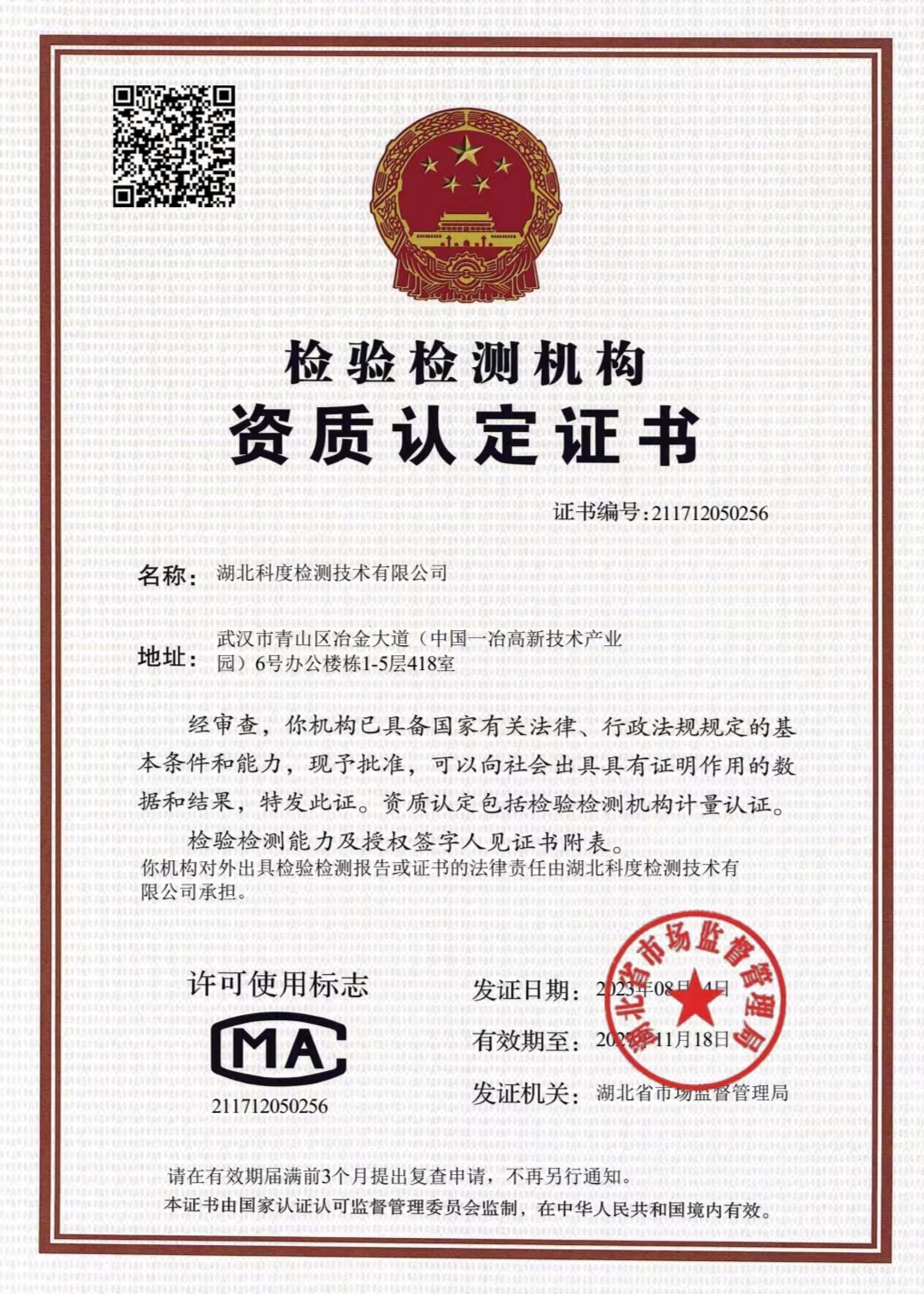湖北科度檢測技術(shù)有限公司是一家專業(yè)從事環(huán)境類及相關領域檢測的第三方檢測機構(gòu),公司已通過湖北省市場監(jiān)督管理局CMA計量認證,可以面向社會出具權(quán)威CMA檢測報告。 我公司實驗室嚴格按照國家標準建設,擁有一大批國內(nèi)外先進儀器設備及現(xiàn)代化配套設施,并有經(jīng)驗豐富的中高級專業(yè)技術(shù)人員和嚴格的實驗室質(zhì)量保證體系為項目運作提供強力支撐。 作為第三方檢測機構(gòu),公司始終以高度的社會責任感經(jīng)營企業(yè),以“公正、嚴謹、高效”為宗旨,依托專業(yè)的技術(shù)實力為客戶提供專業(yè)優(yōu)質(zhì)檢測服務,受到政府、企業(yè)和社會各界的廣泛關注和認可。
